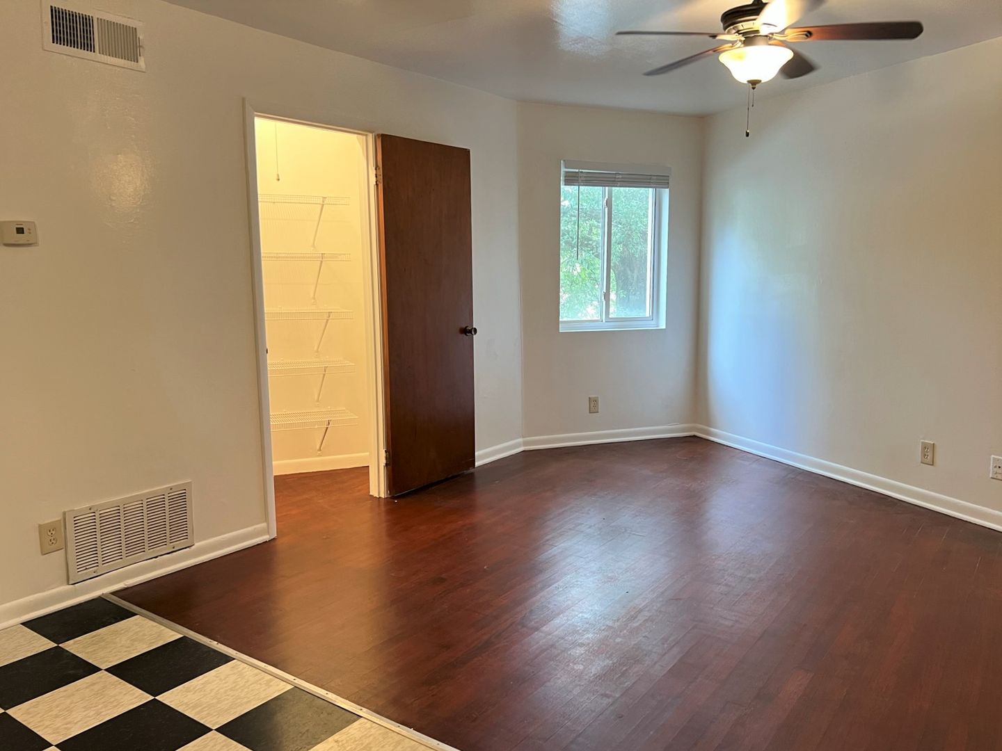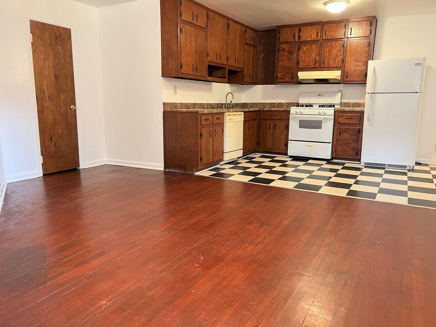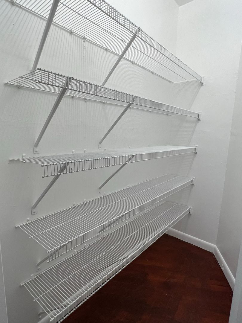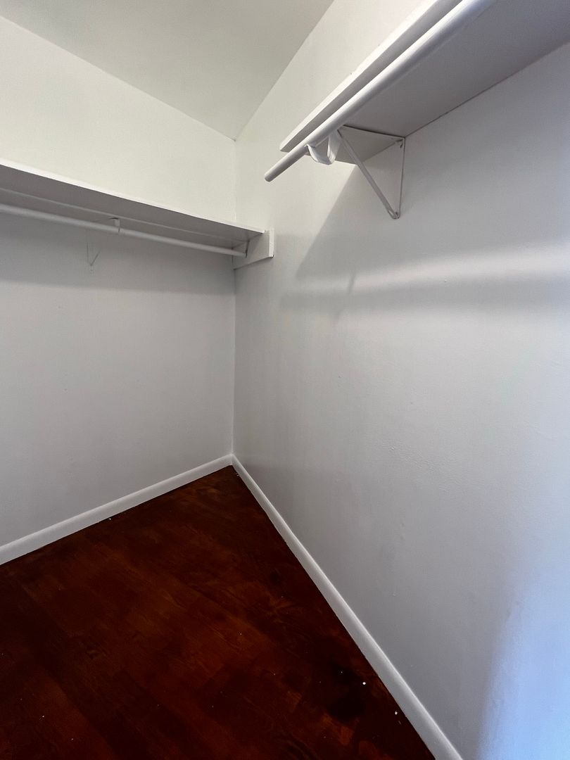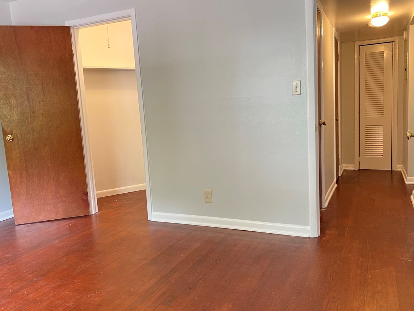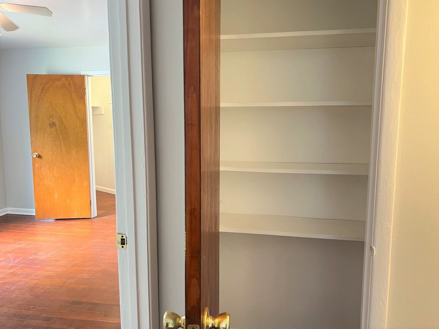 Unique floor plan, this apartment has hardwood floors, spacious open kitchen and living room. Linen closet in hall plus walk-in food pantry and additional walk-in storage closet.