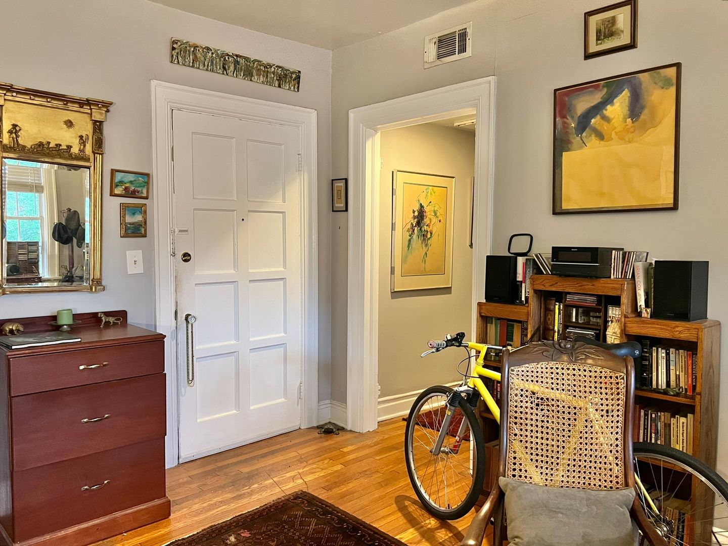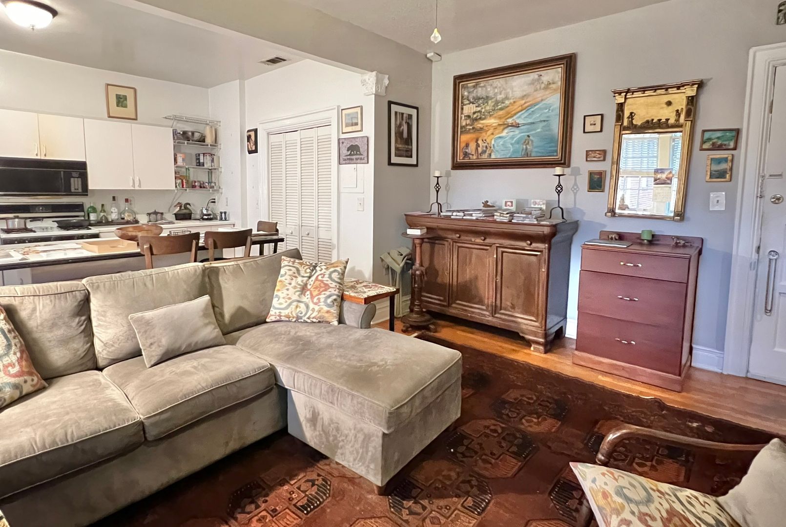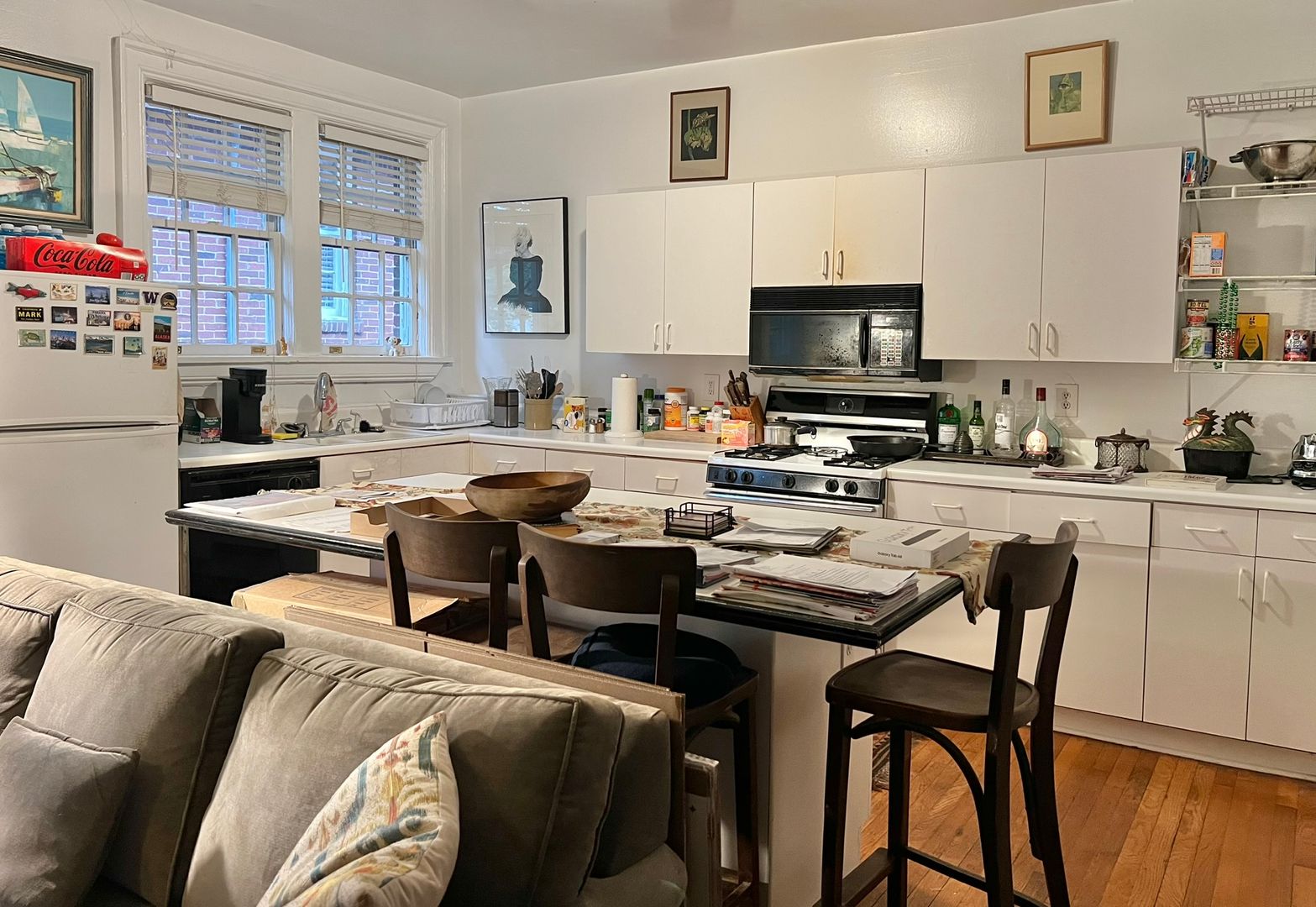This renovated apartment boasts a large kitchen island, washer/dryer in-unit, central heat & air, dishwasher, garbage disposal, and tall sunny windows that flood the space with natural light. The hardwood floors and full kitchen pantry add to the appeal of this boutique building.