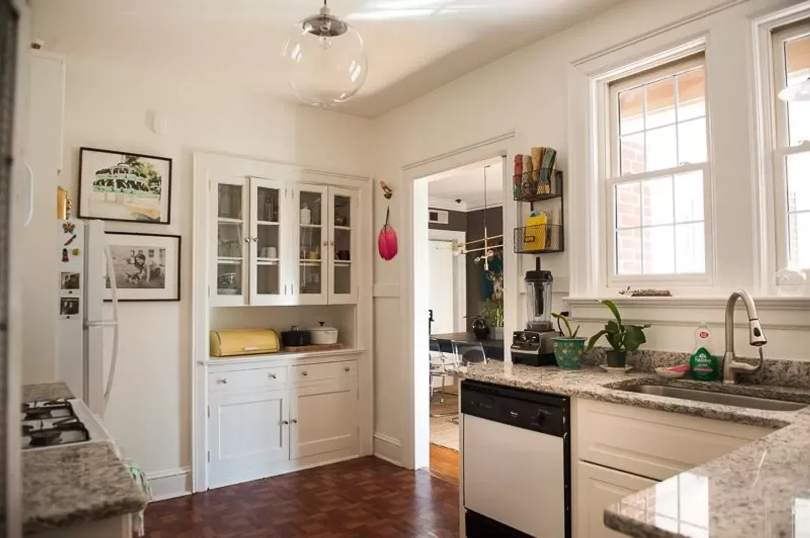 This newly remodeled kitchen has granite countertops and farmhouse sink with goose neck faucet. A screened in porch is off the dining room with a ceiling light and power.