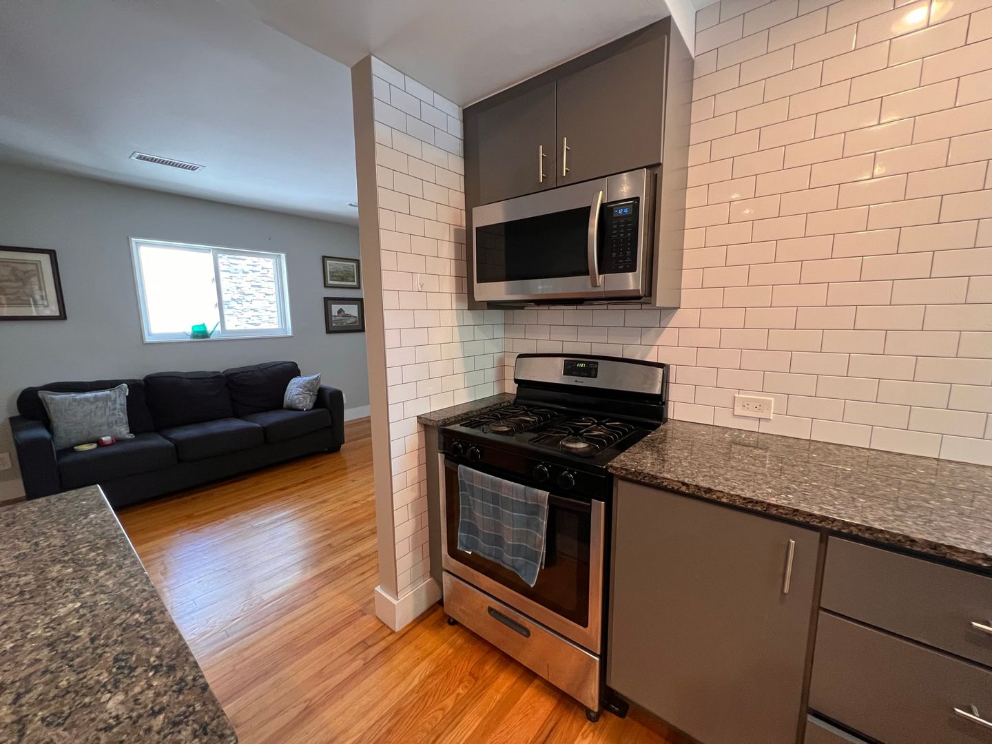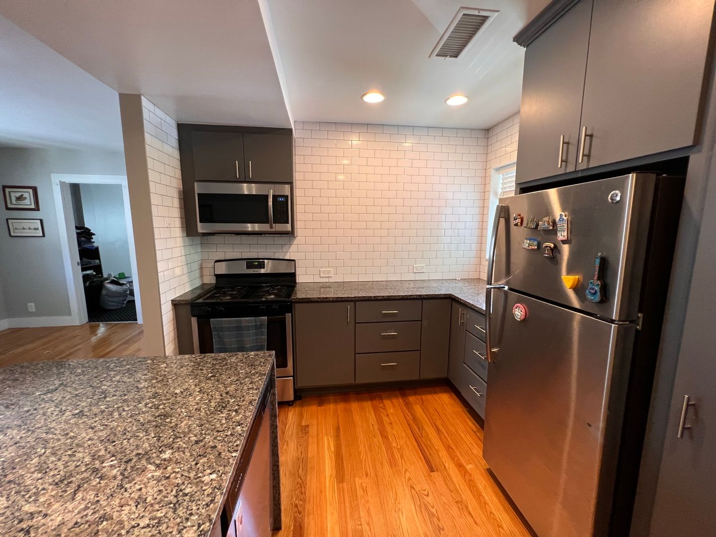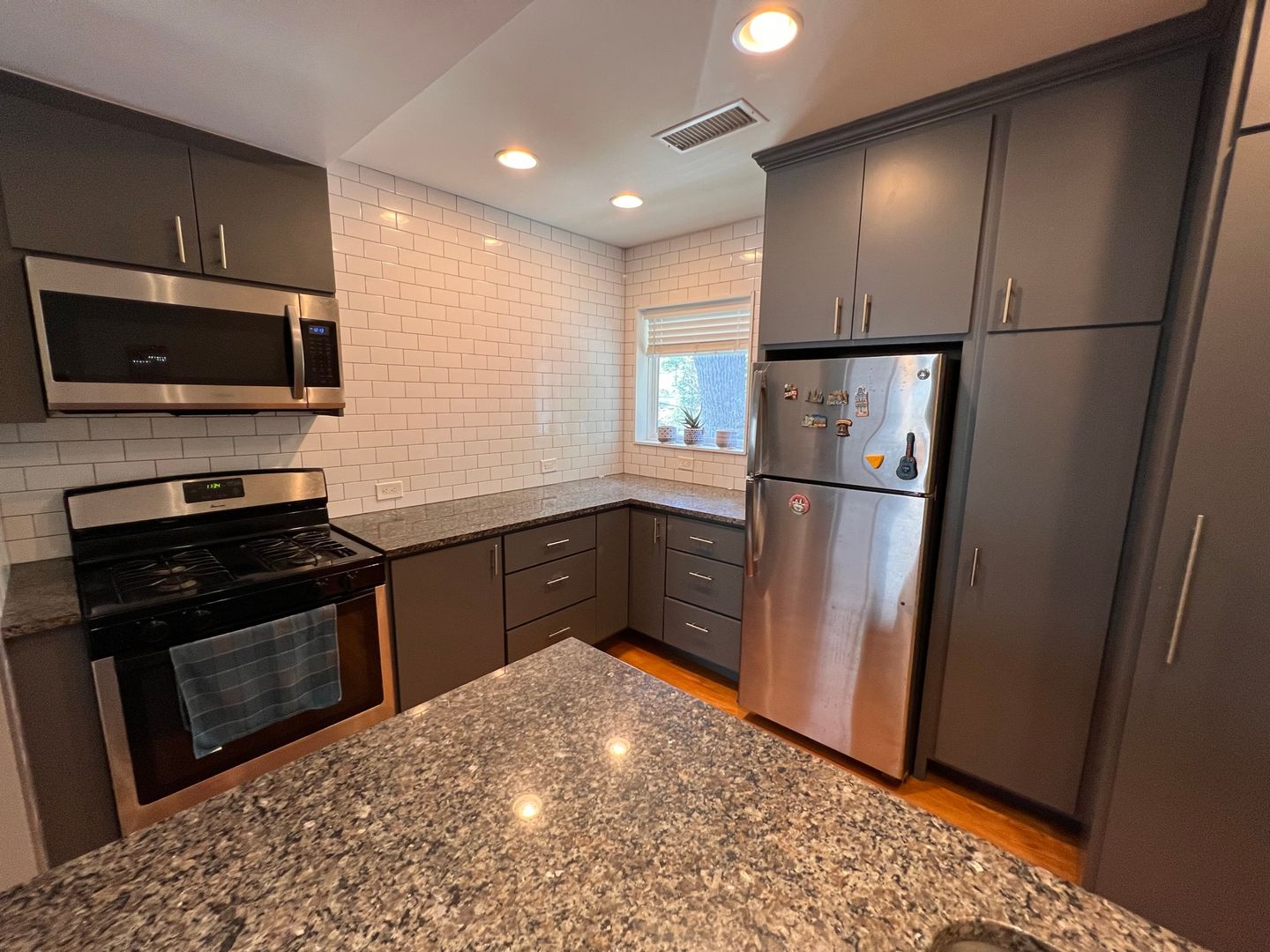 Granite counter tops, stainless appliances, subway tile backsplash, dishwasher, washer dryer in unit, central heat and air, ceiling fan, custom tile bathroom, large bedroom with huge walk-in closet, office nook.