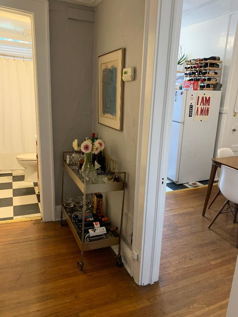 The apartment offers original hardwood floors, central heat and air, and huge brightly lit bedroom. Floor plan includes additional dining room or small home office.