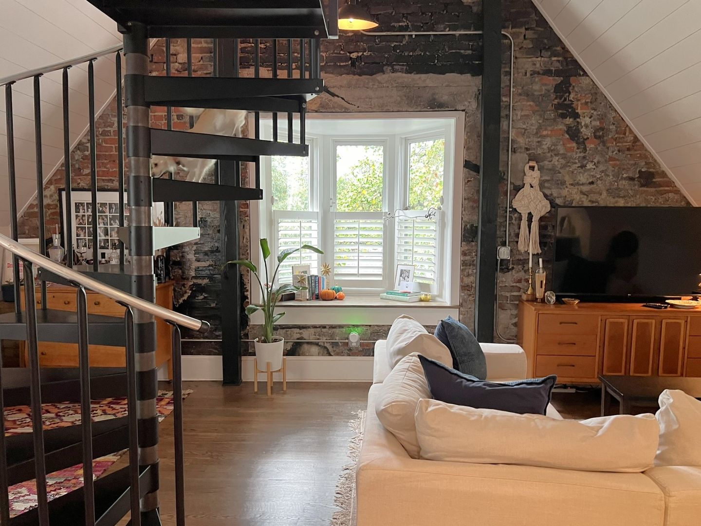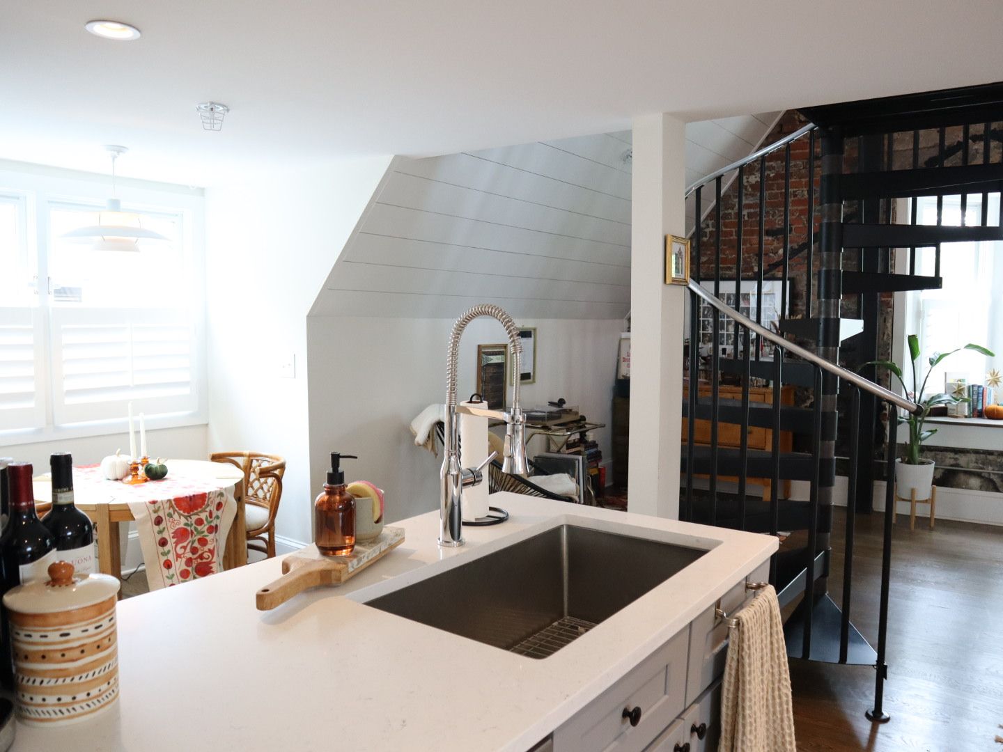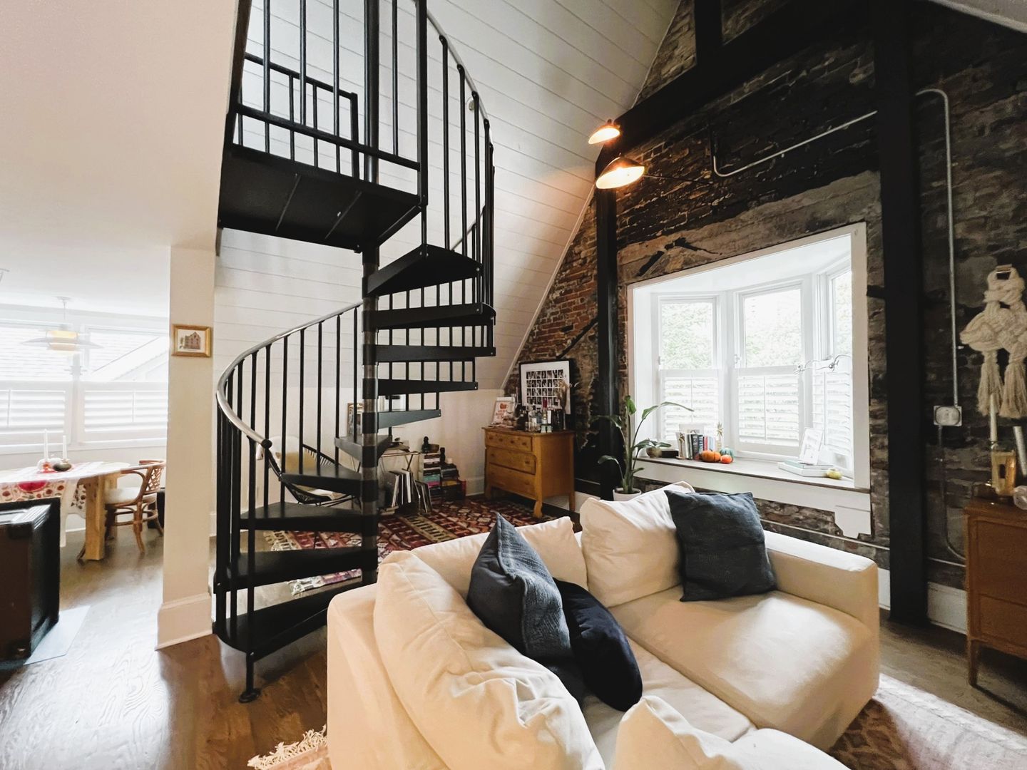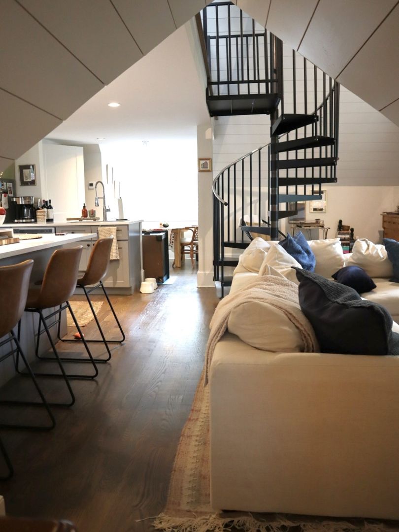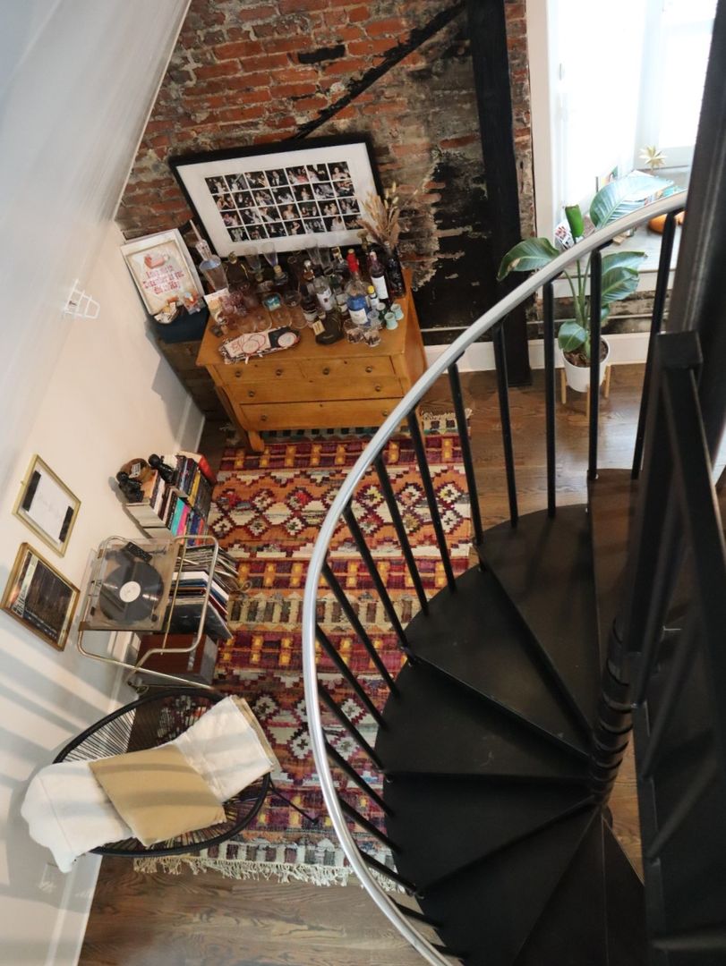 Open concept living space includes half bath, book nook, small office space, bay window and spiral staircase.