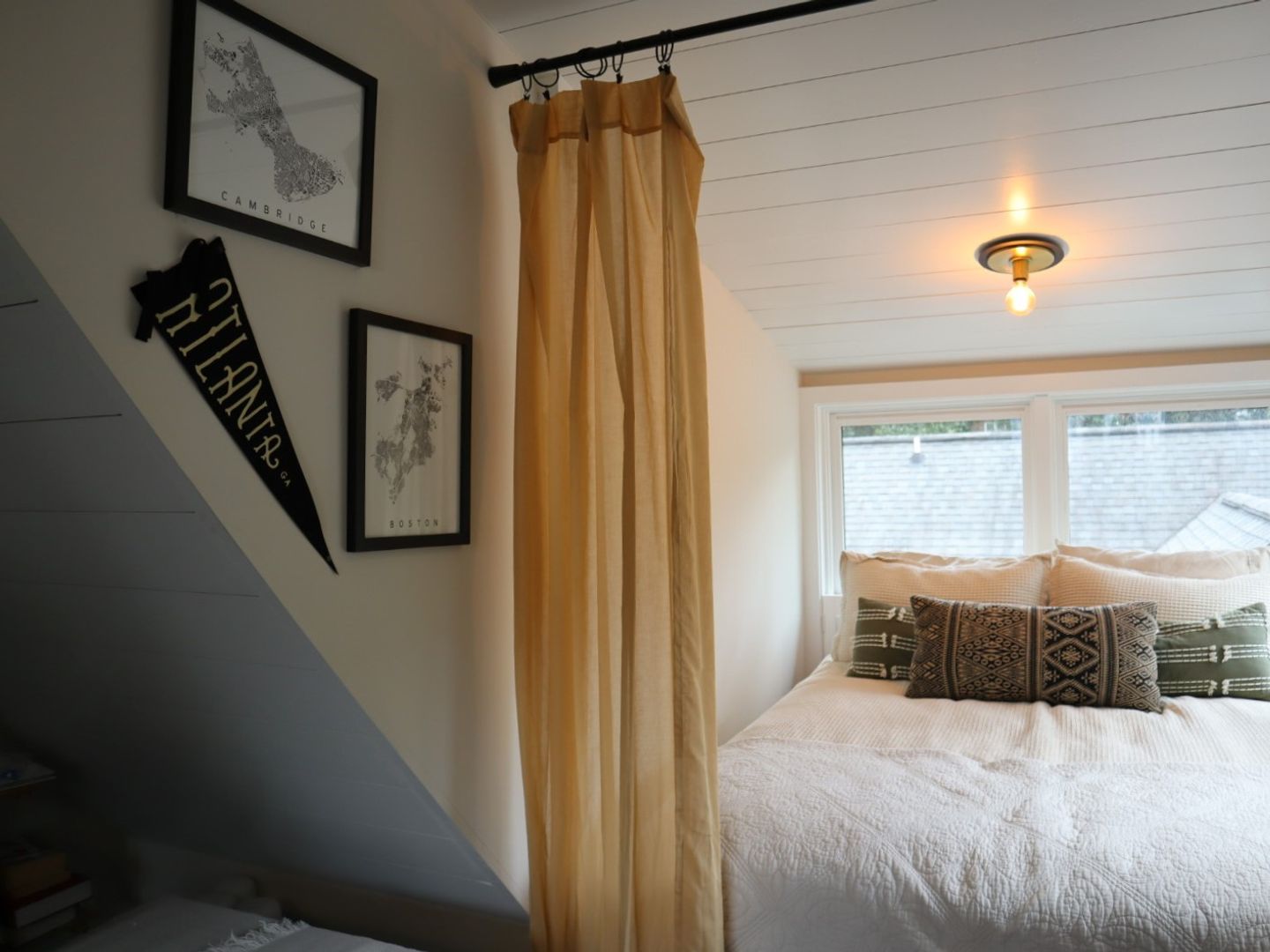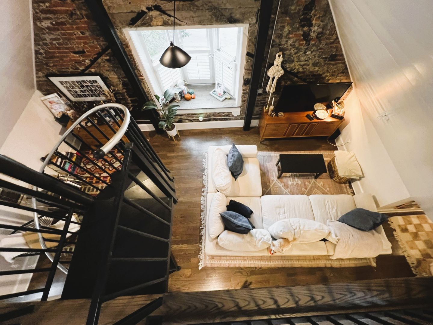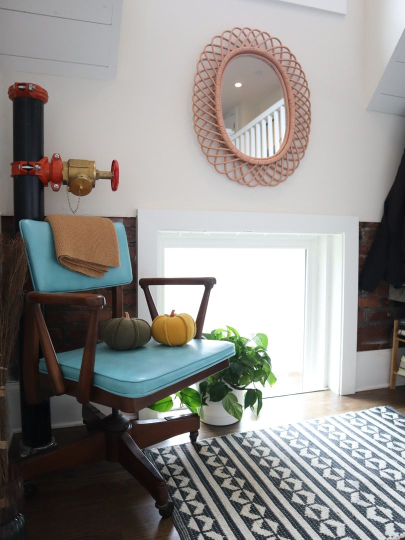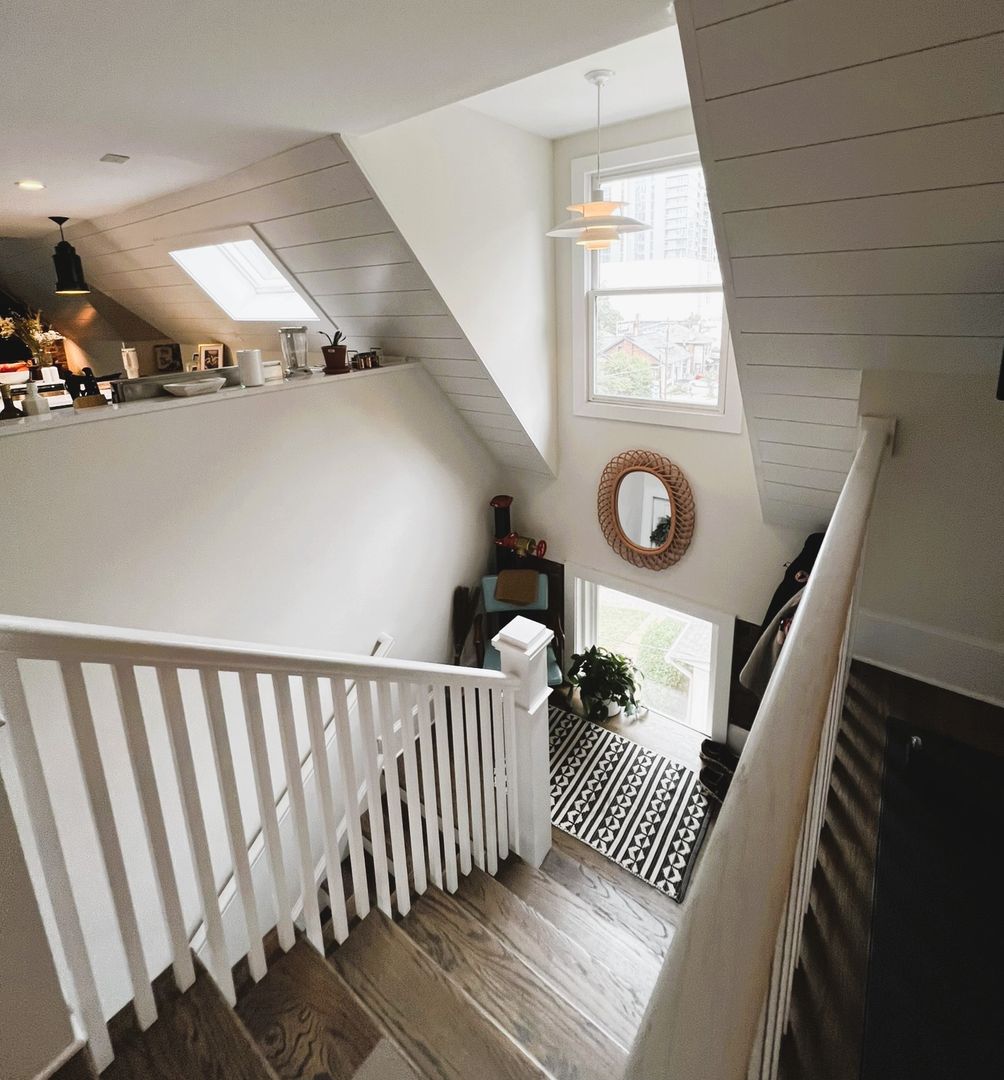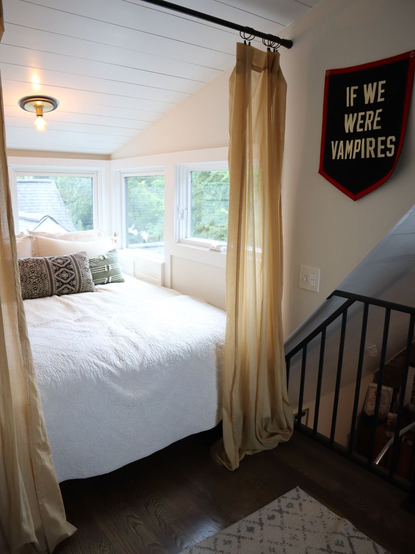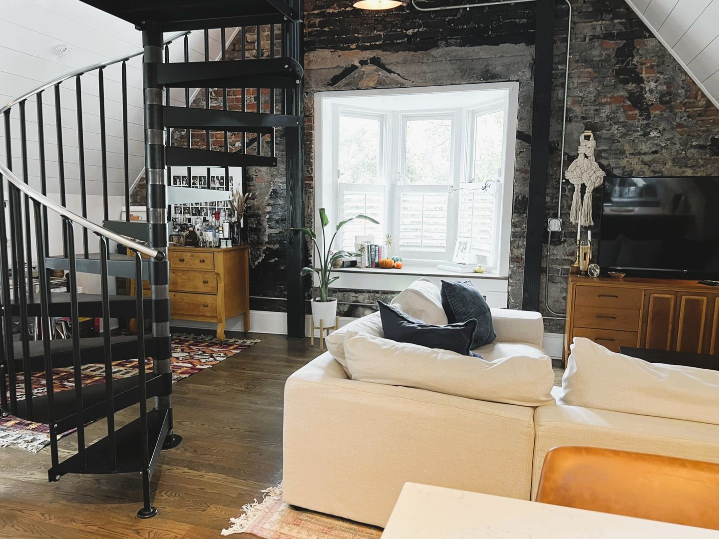 Open concept living space includes half bath, book nook, small office space, bay window and spiral staircase.