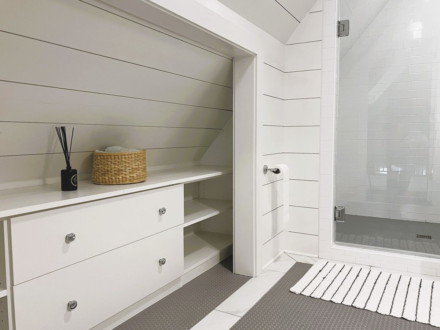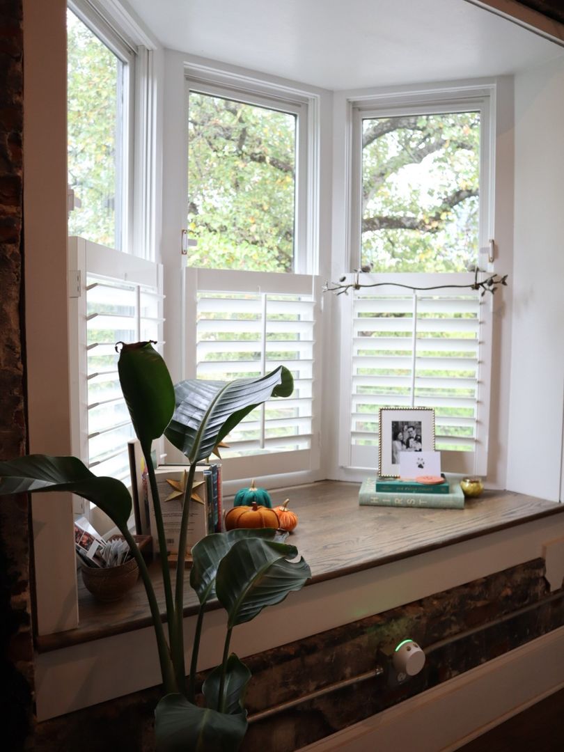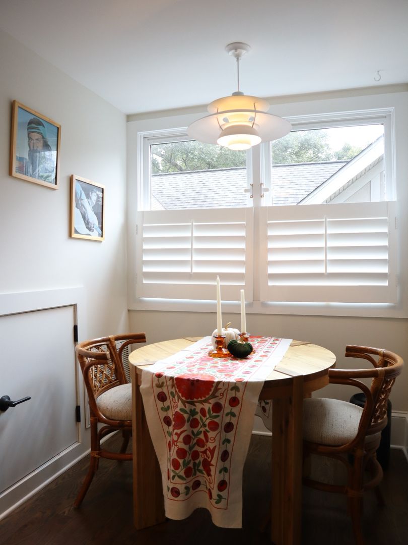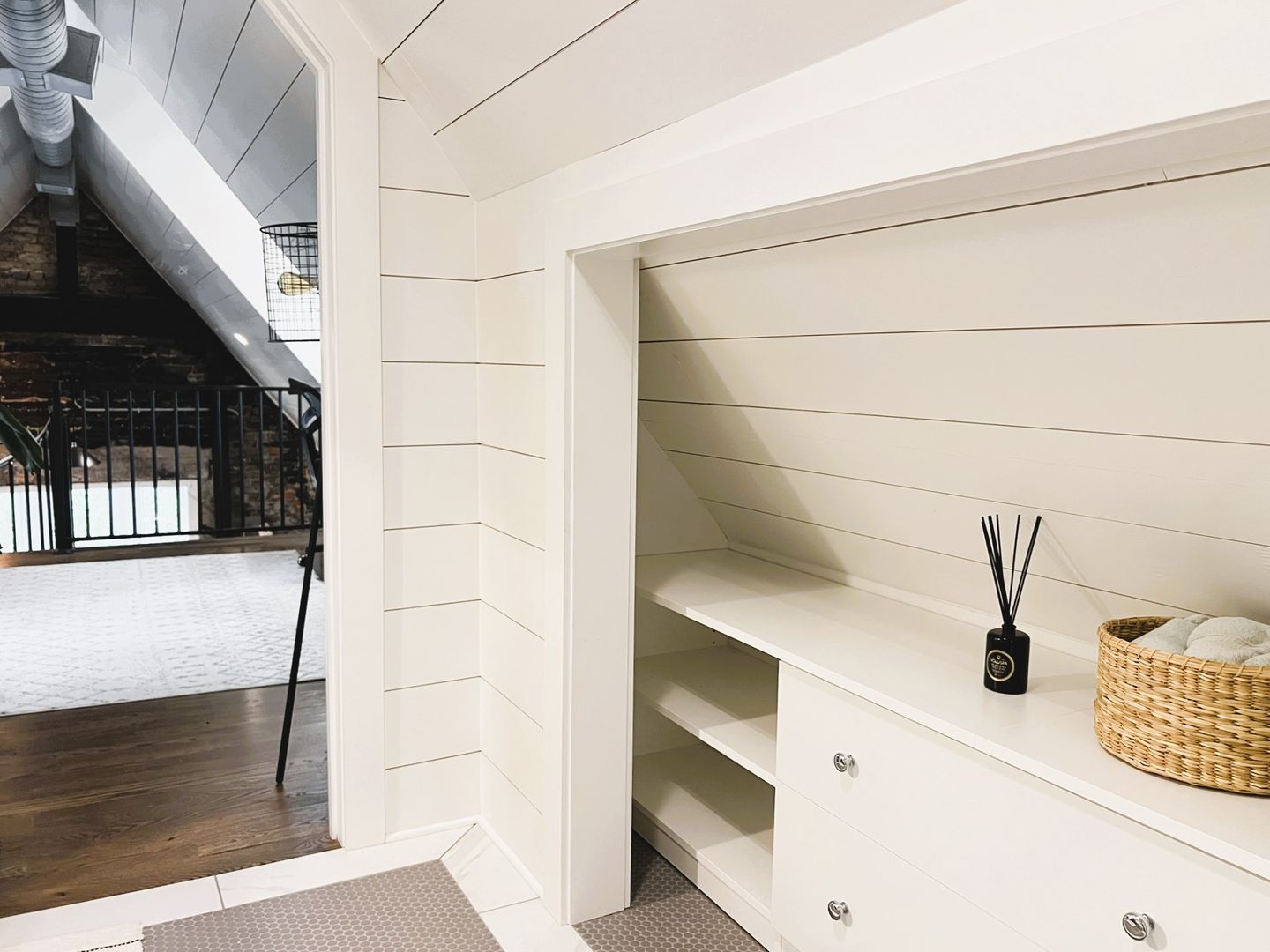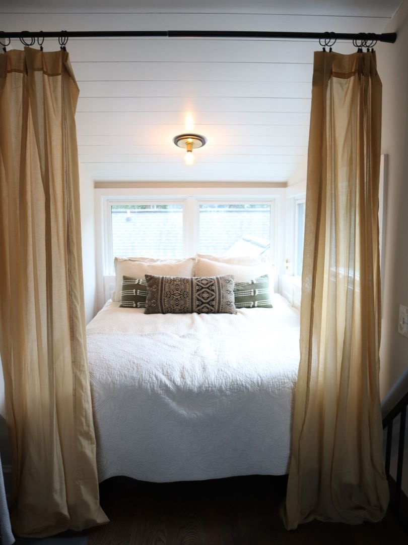 Open concept living space includes half bath, book nook, small office space, bay window and spiral staircase.