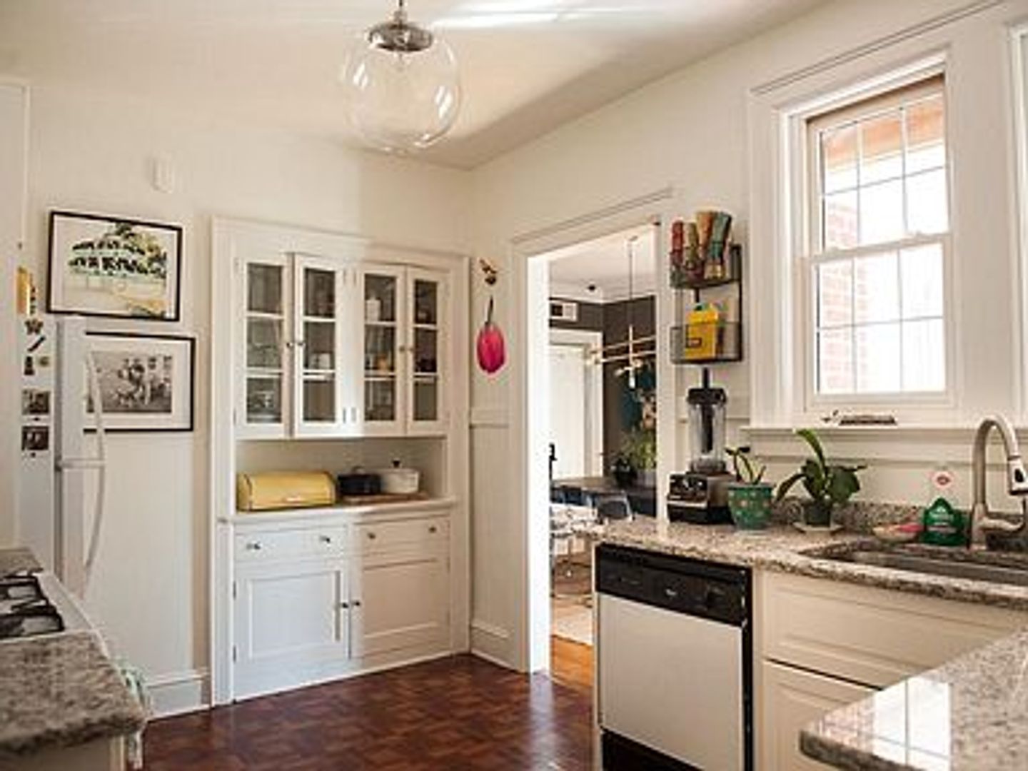 1300 sq. ft with hardwood floors, high ceilings and crown moulding. The recently remodeled kitchen has granite countertops, a large stainless steel sink with a goose neck faucet, and new cabinets with built-ins.